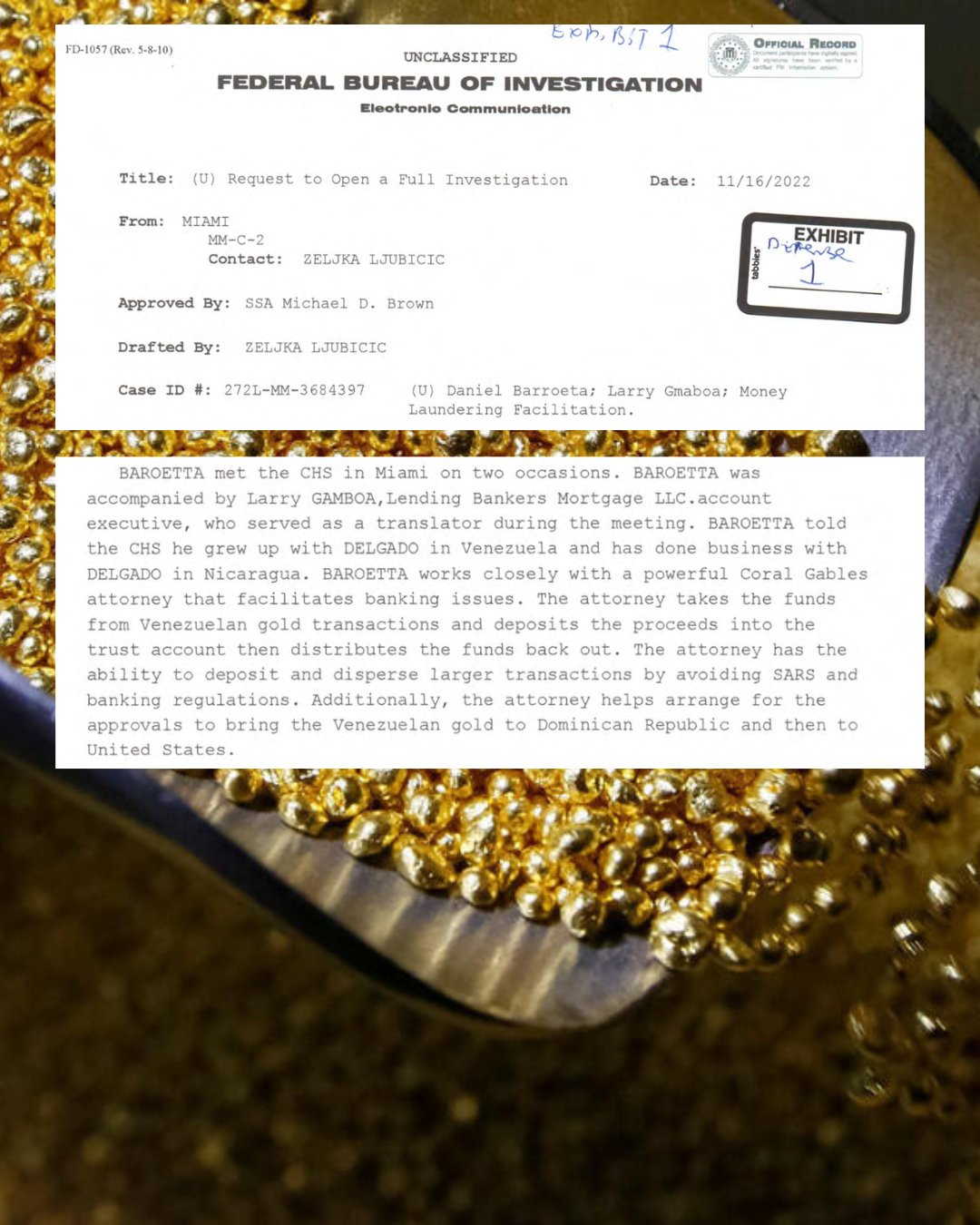 En el Anexo 40 de dicha acusación, el ciudadano venezolano Daniel Barroeta es identificado como un operador clave en una estructura criminal dedicada al contrabando de oro extraído ilegalmente en Venezuela. Según el documento, Barroeta actúa en estrecha colaboración con un poderoso abogado radicado en Coral Gables, Florida, quien habría facilitado transacciones financieras y bancarias internacionales, además de coordinar la logística para mover el oro venezolano hacia República Dominicana, desde donde posteriormente es canalizado hacia Estados Unidos.
